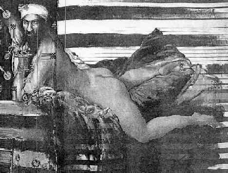 Synthèse des civilisations ? L’Occident licencieux (peinture de Boucher du XVIIIème s.) par rapport à l’Islam vertueux (photo de Ben Laden), les deux confrontées au rêve de la technologie américaine (les motos en toile de fond).