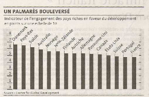 Ainsi, selon un graphique établi par un « réservoir à idées » américain (Think Tank) le Center for global développment (CGD) le palmarès n’est guère élogieux pour la France. Il est vrai qu’une étude du même genre de l’OCDE place la France au 7ème rang (ce qui est mieux) des 22 pays donateurs étudiés….