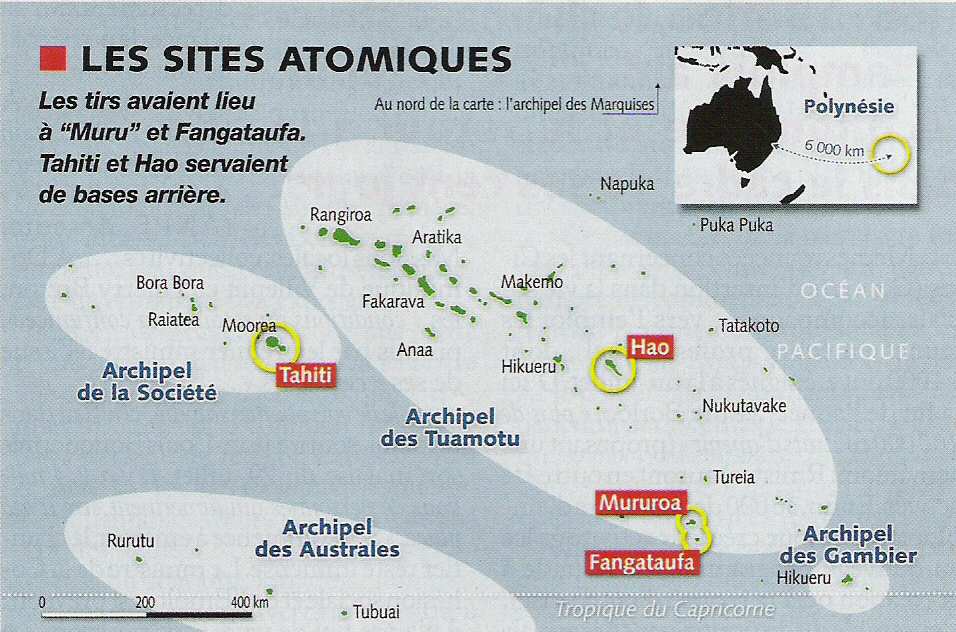 « Valeurs Actuelles » du 5 Août 2005 nous apprend qu’un accord a été passé entre le gouvernement de la Polynésie française et celui de la république française : c’est le Ministère de la Défense de cette dernière et non le gouvernement de Papeete qui aura la charge d’assurer la sécurité – politique et sanitaire des 2 atolls de Mururoa et Fangataufa où se sont déroulés jusqu’au 27 janvier 1996 les essais atomiques français…. Les récifs sont auscultés désormais 24h sur 24 pour déceler toute trace de présence radioactive. Le centre d’expérimentation du Pacifique (le CEP) responsable des opérations de surveillance déclare que « Muru et Fanga » sont les îles les plus surveillées du monde !